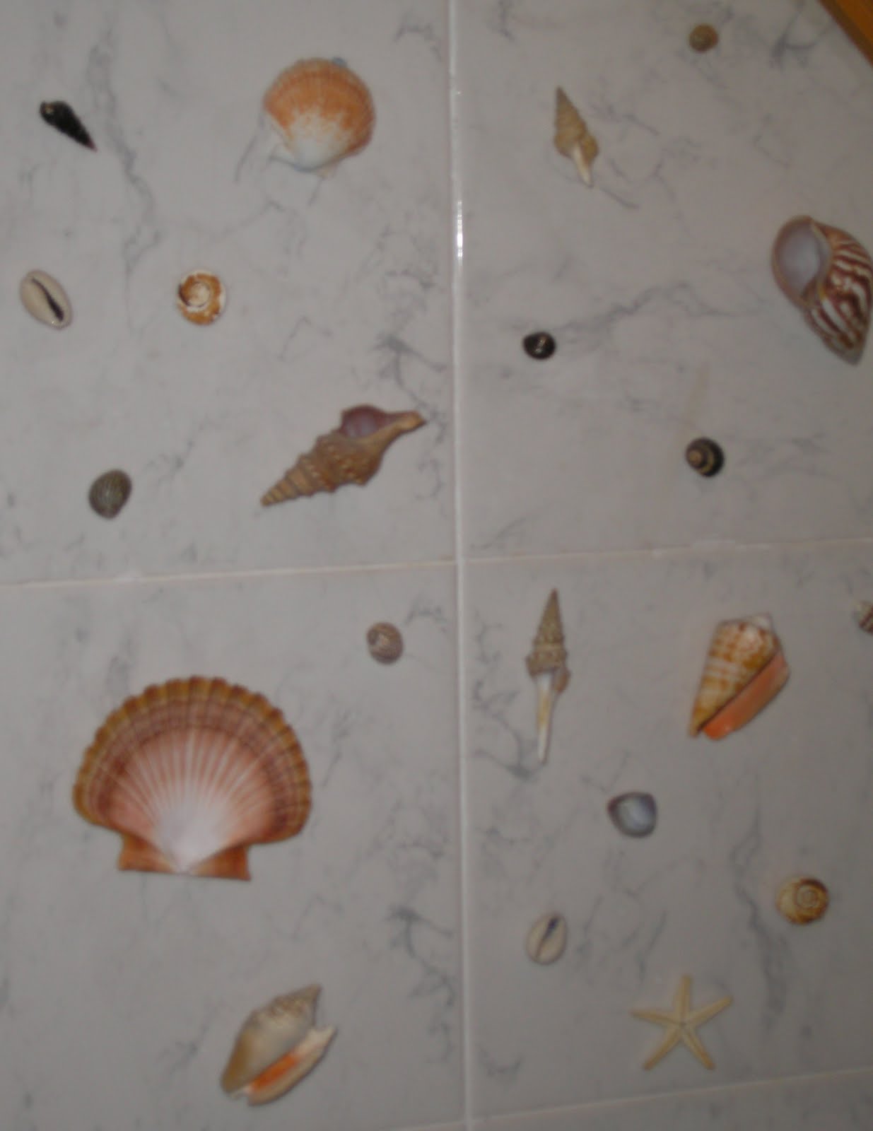 A fürdőnket úgy tehetjük egyedivé,hogy alúlra ragasztunk egy réteg kék tenger motívumot jelképező kéket,az alá kis barnásat világosat ,a tenger homokját jelképezően,és a homok részre ráragasztani a kagylókat és felülre pedig kereshetünk kis halas figurákat vagy  akár valamilyen csíkóhalasat ,akármilyent.